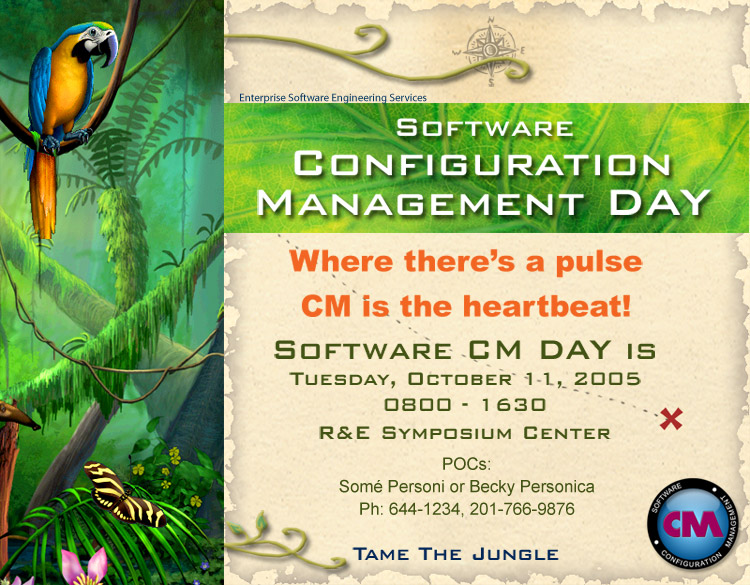 I created this branding theme for CM Day 2005 and it was used on trifold brochures, name badges, PowerPoint slides, web pages, a DeskTopper background, and flyers at the event. These images shown here have had all the text and names of people 'fictionalized' due to the environment they were originally used in.